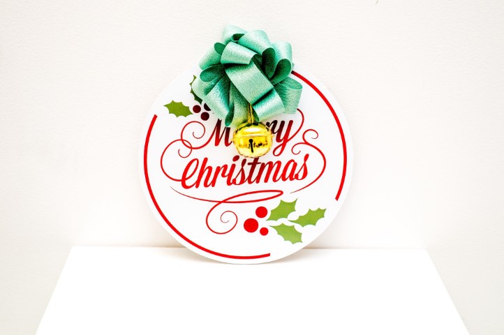 Ξύλινη διακοσμητική πινακίδα με Χριστουγεννιάτικο μήνυμα, διακοσμημένη με εντυπωσιακό βεραμάν φιόγκο και χρυσό κουδουνάκι. Διάμετρος 20εκ.