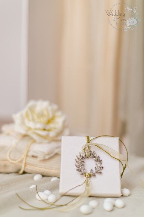 Μπομπονιέρα σε πλακέ κουτί (διαστάσεων 10x10x2) δεμένη με μεταλλικό στεφανάκι γούρι και επτά κουφέτα Χατζηγιαννάκη. Για αλλαγές στα χρώματα επικοινωνήστε με το κατάστημά μας.