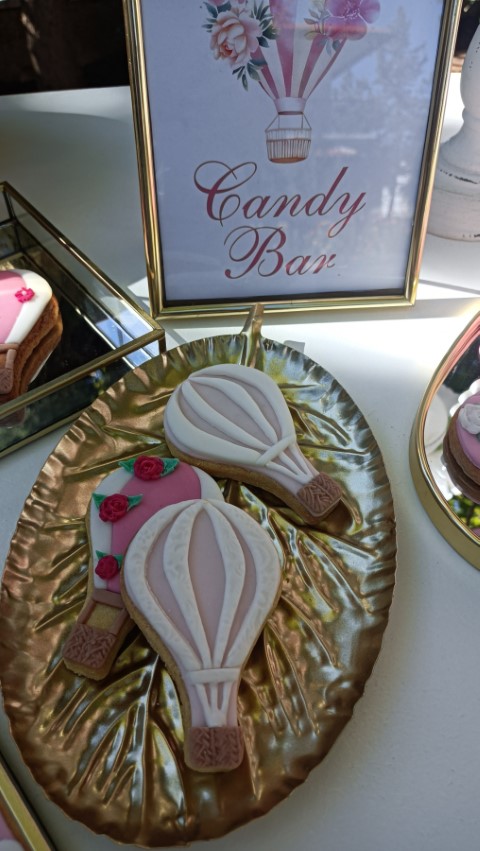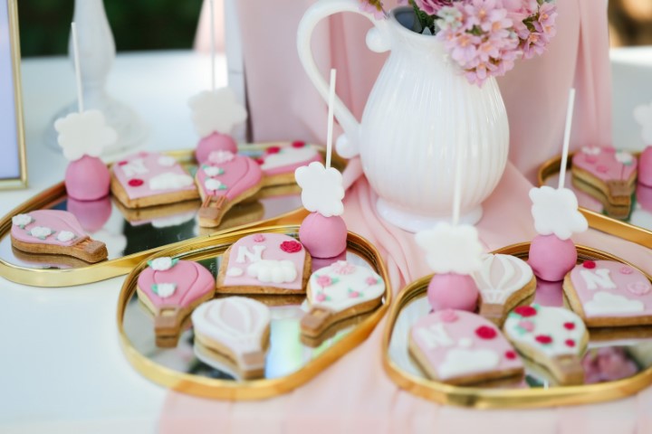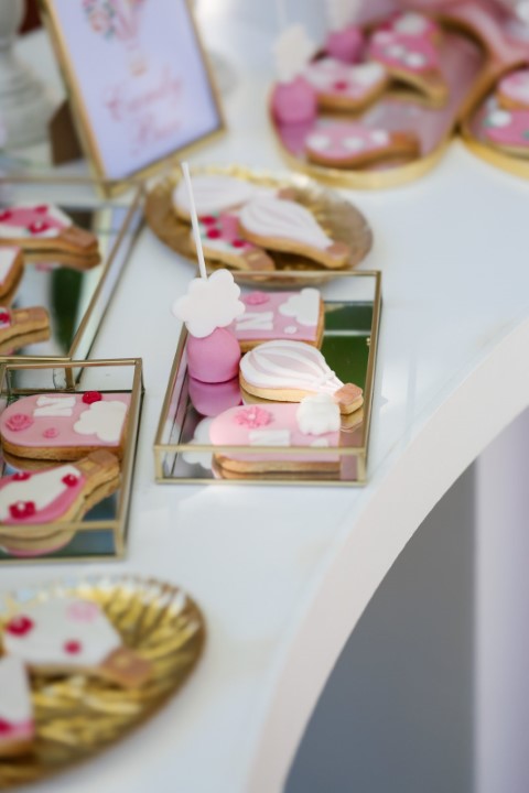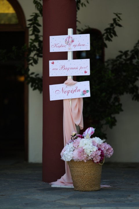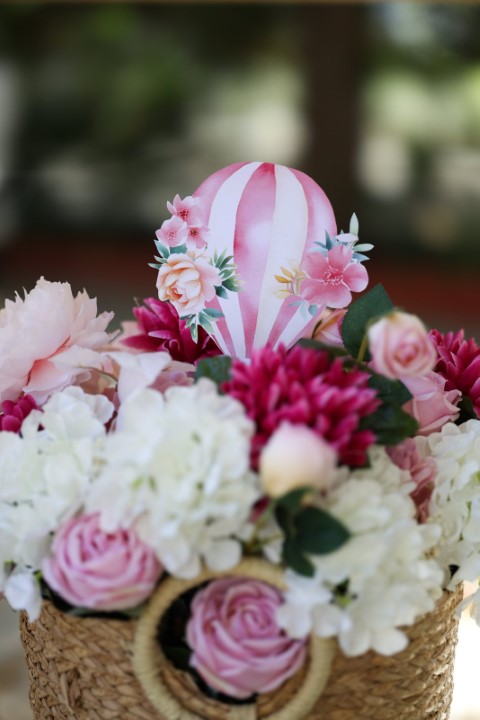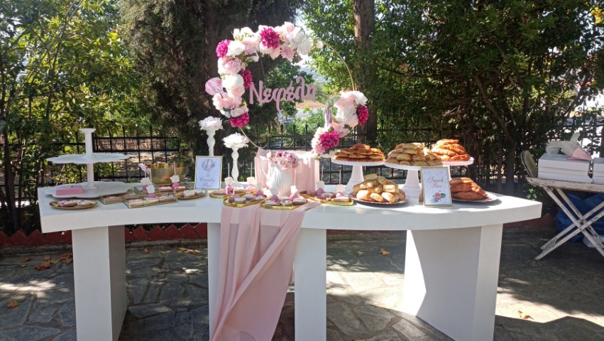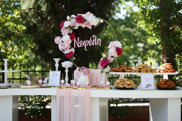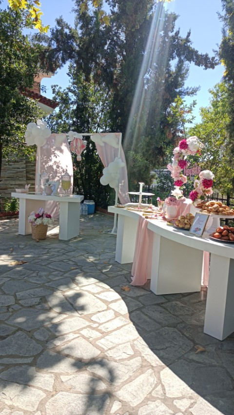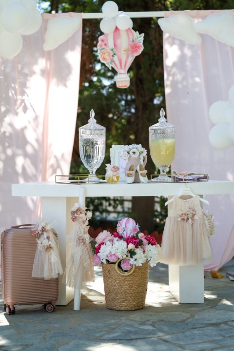 Όμορφη βάπτιση με θέμα το αερόστατο σε λευκές και ροζ αποχρώσεις. Candy bar με λαχταριστά γλυκά, κεντρικό στοιχείο στο dessert table η στρόγγυλη μεταλλική βάση διακοσμημένη με λουλούδια και το όνομα της νεοφώτιστης, μπαλόνια, φιγούρες από αερόστατα και δωράκια για τους καλεσμένους, όλα βασισμένα και συνδυασμένα με το concept. Εντυπωσιακή η διακόσμηση της αψίδας, όπου φωτογραφήθηκαν όλοι οι καλεσμένοι με την μικρή Νεφέλη.