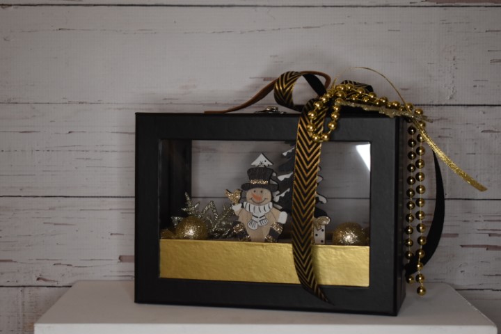 Κουτί σε σχήμα βαλιτσάκι που περιέχει ξύλινη φιγούρα χιονάθρωπου επάνω σε έλκυθρο, Χριστουγεννιάτικες μπαλίτσες και χιονονιφάδες. Διαστάσεις: 22x10x16εκ.