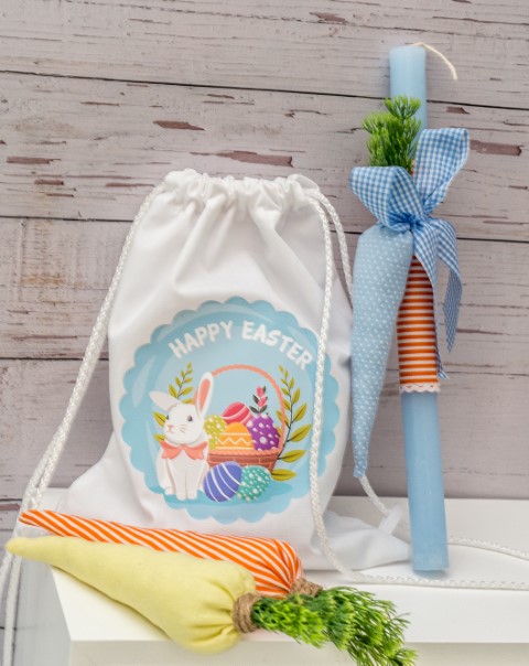 Σακίδιο πλάτης με πασχαλινή παράσταση. Περιλαμβάνει λαμπάδα και διακοσμητικά καρότα.