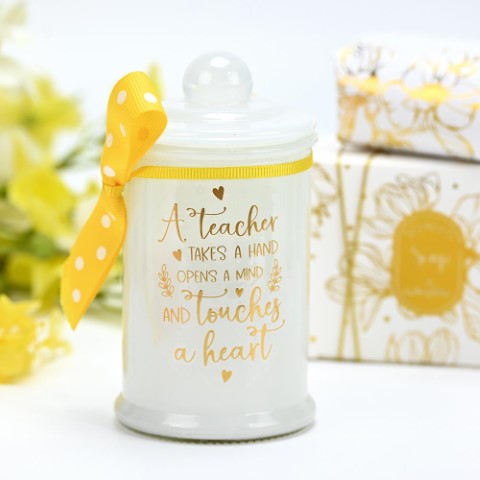 Αναδείξτε την εκτίμησή σας με ένα μοναδικό αρωματικό κερί με άρωμα fresh floral που αποπνέει φρεσκάδα και διακριτική κομψότητα. Το κερί συνοδεύεται από ένα ιδιαίτερο μήνυμα αφιερωμένο στην αγαπημένη σας δασκάλα. Διάσταση 6x11 εκ.