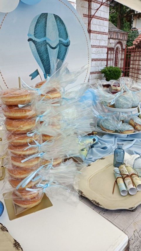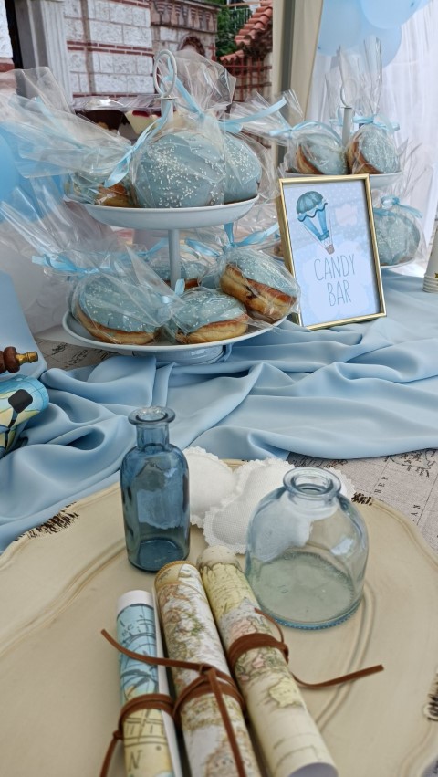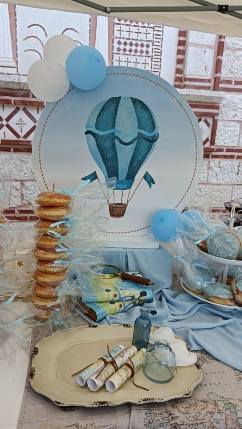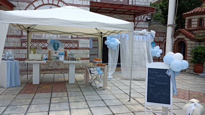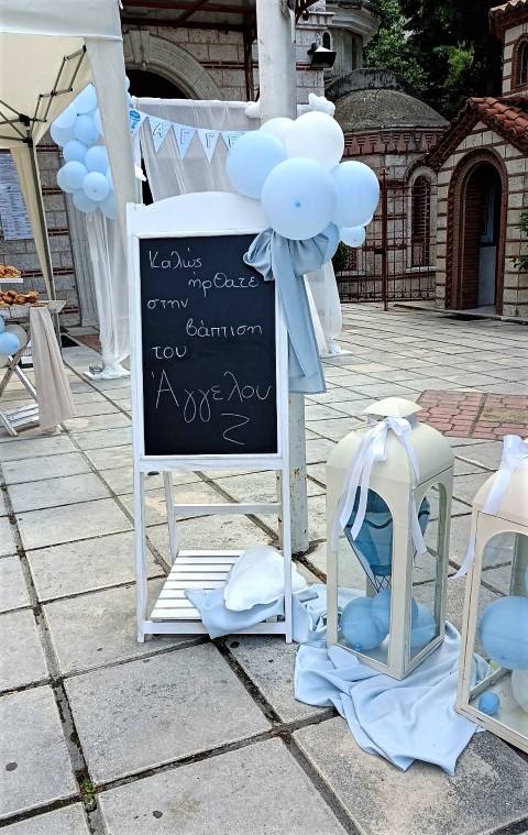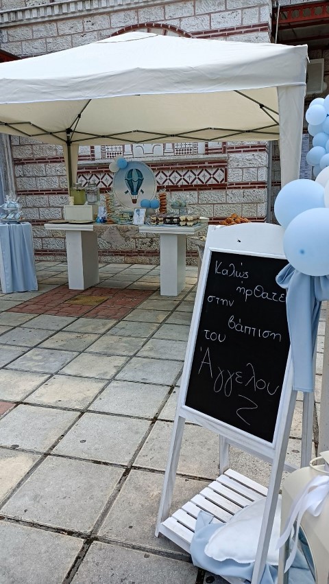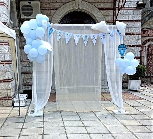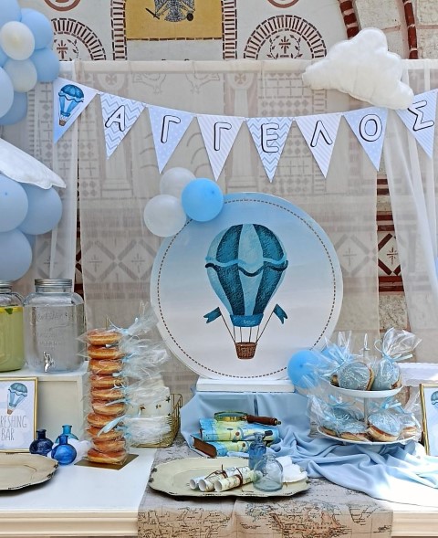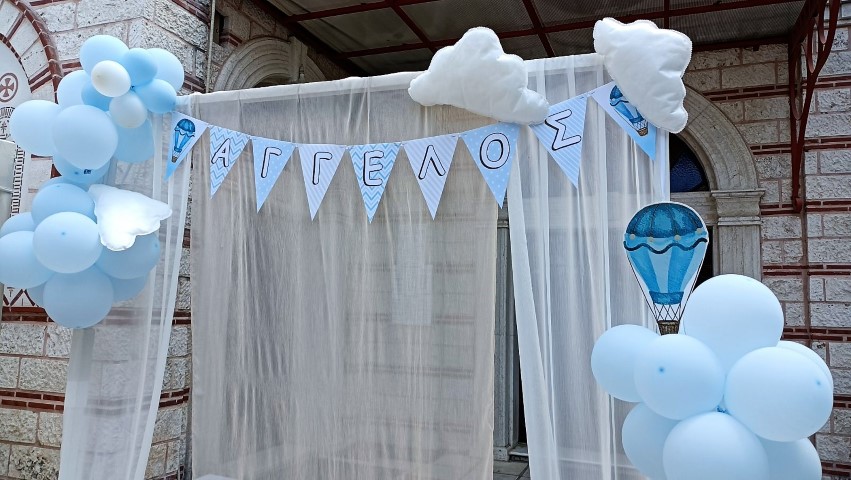 Όμορφη βάπτιση με θέμα το αερόστατο σε λευκές και γαλάζιες αποχρώσεις. Candy bar με λαχταριστά γλυκά, κεντρικό στοιχείο στο τραπέζι στρόγγυλη βάση με καμβά, μπαλόνια, φιγούρες και δωράκια για τους καλεσμένους, όλα βασισμένα και συνδυασμένα με το concept. Εντυπωσιακή η διακόσμηση της αψίδας, όπου φωτογραφήθηκαν όλοι με τον νεοφώτιστο Άγγελο!