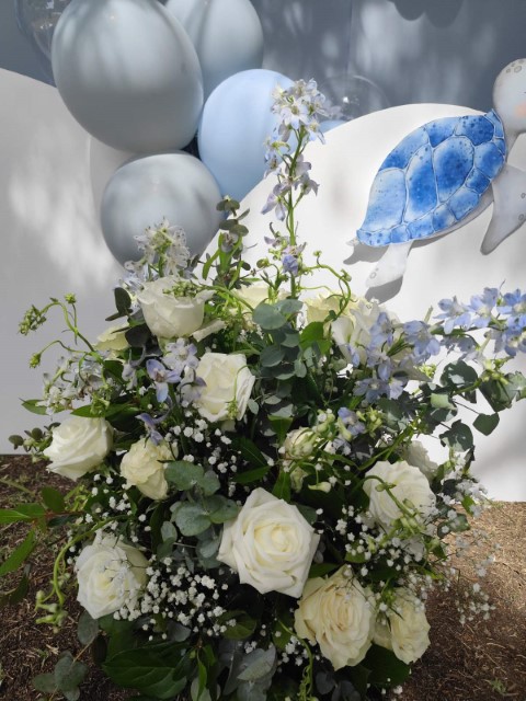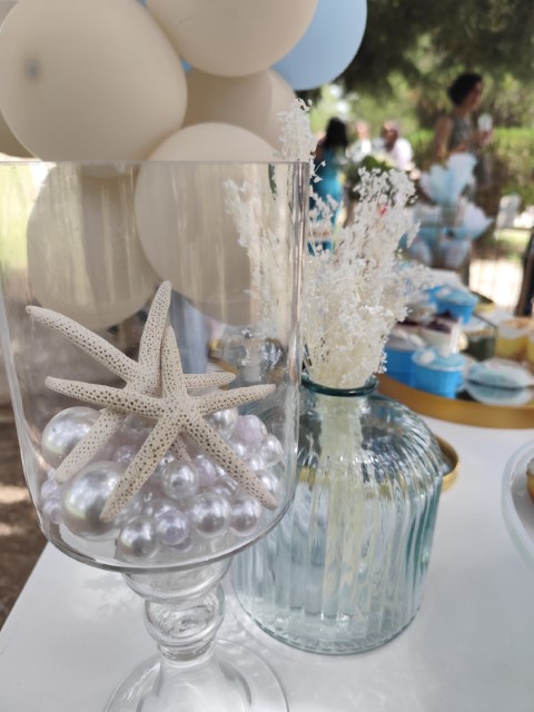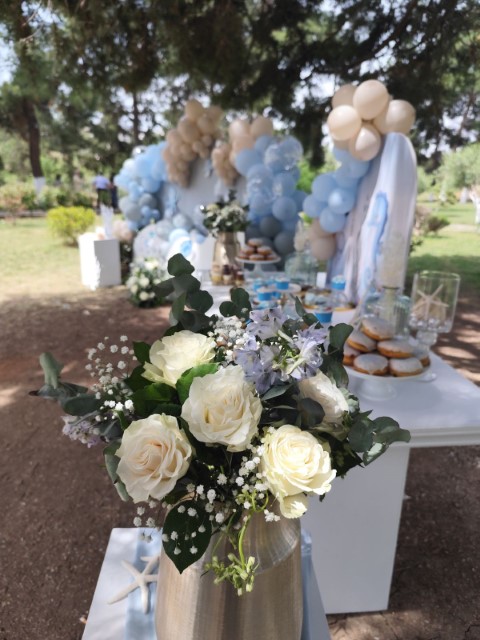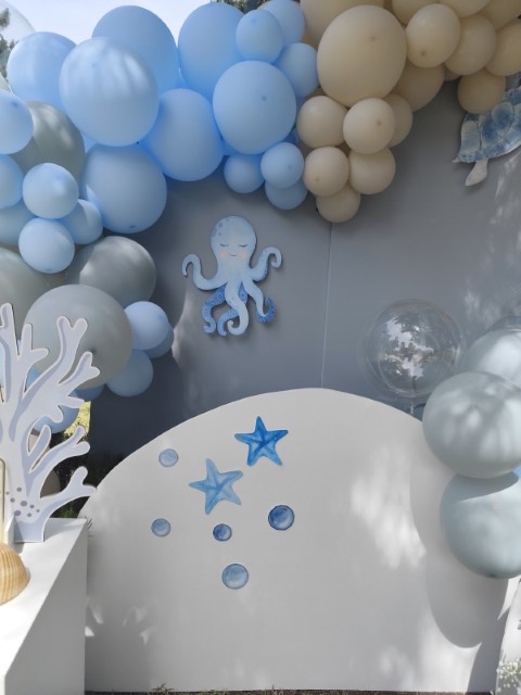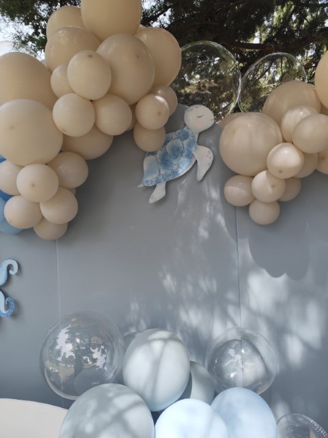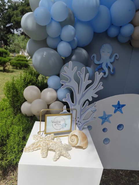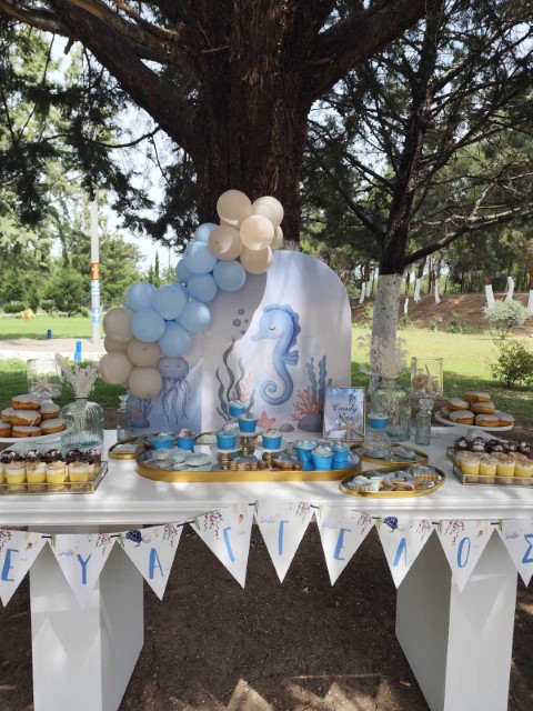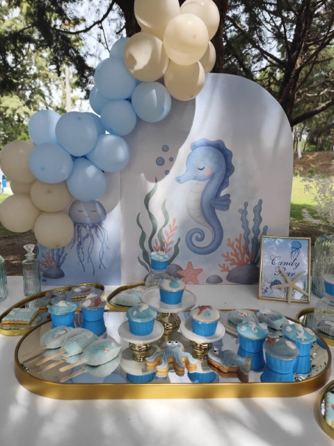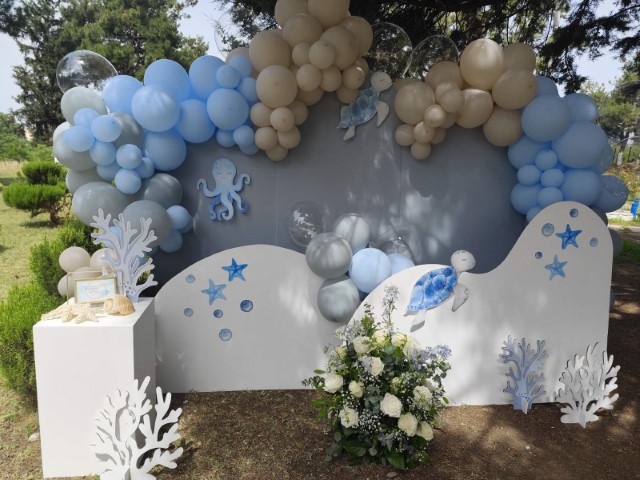 Ένα ταξίδι στον μαγευτικό κόσμο του βυθού δίνει έμπνευση σ' έναν ξεχωριστό στολισμό βάπτισης. Αποχρώσεις του σιέλ συνδυάζονται αρμονικά με χαριτωμένα θαλάσσια ζωάκια, δημιουργώντας ένα δροσερό και ονειρικό σκηνικό. Ανάλαφρες υφές και προσεγμένες λεπτομέρειες ολοκληρώνουν ένα καλαίσθητο concept που αποπνέει φαντασία και παιδική αθωότητα.