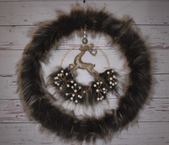 Διπλό γούνινο στεφάνι σε καφέ χρώμα διακοσμημένο με τάρανδο και πέρλες. Διάμετρος 44εκ.