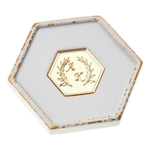Μπομπονιέρα κεραμικό εξάγωνο σουβέρ με plexiglass στο κέντρο και χαραγμένα μονογράμματα. Διάμετρος 10 εκ.