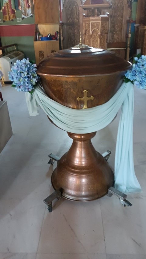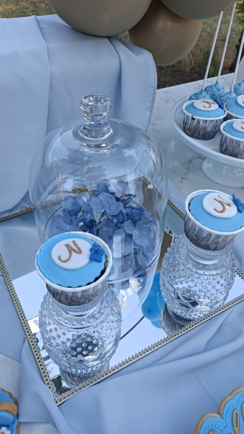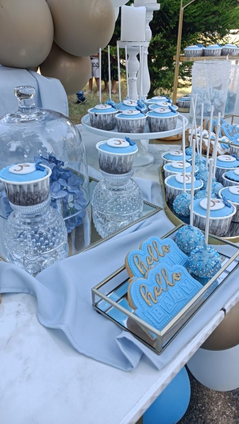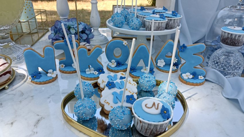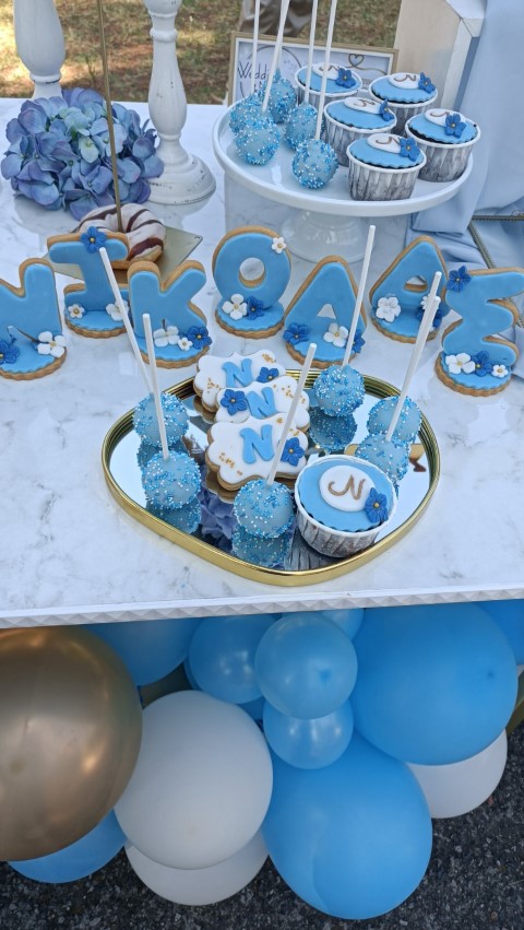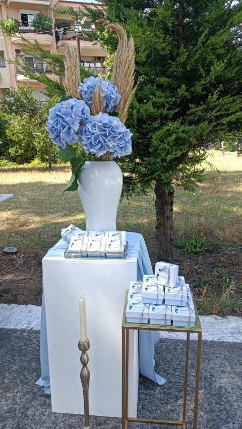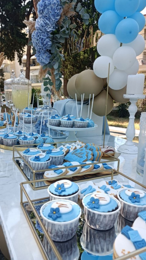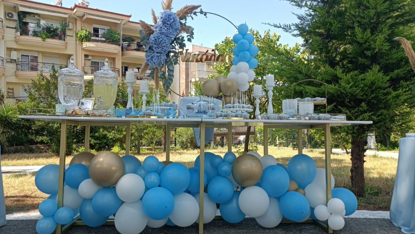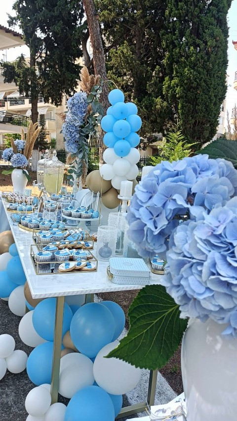 Εντυπωσιακό dessert table, με κεντρικό στοιχείο στρόγγυλη μεταλλική βάση, διακοσμημένη με μπλε ορτανσίες και το όνομα του παιδιού με plexiglass γράμματα. Μία τρέσα μπαλονιών σε γαλάζιες, λευκές και χρυσές αποχρώσεις είναι τοποθετημένη κάτω άπο το τραπέζι, όπου δημιουργεί ένα εντυπωσιακό αποτέλεσμα. Λευκά βάζα με μπουκέτα λουλουδιών, επιβλητικό welcome stand και μοναδικές λεπτομέρειες διακόσμησης δημιούργησαν μία μαγική βάπτιση γεμάτη κομψότητα!