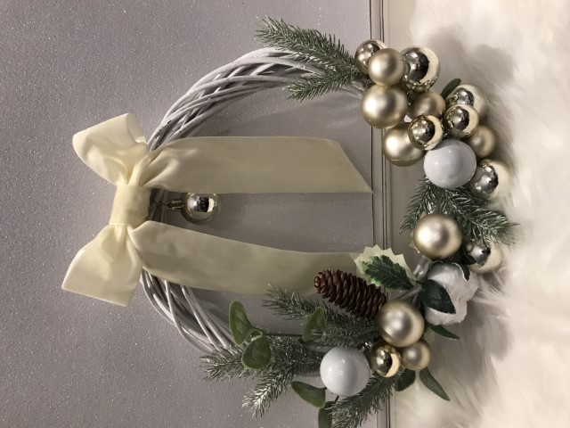 Λευκό στεφάνι λυγαριάς διακοσμημένο με χριστουγεννιάτικες μπάλες, κλαδιά ελάτου, κουκουνάρια και βελούδινη κορδέλα.