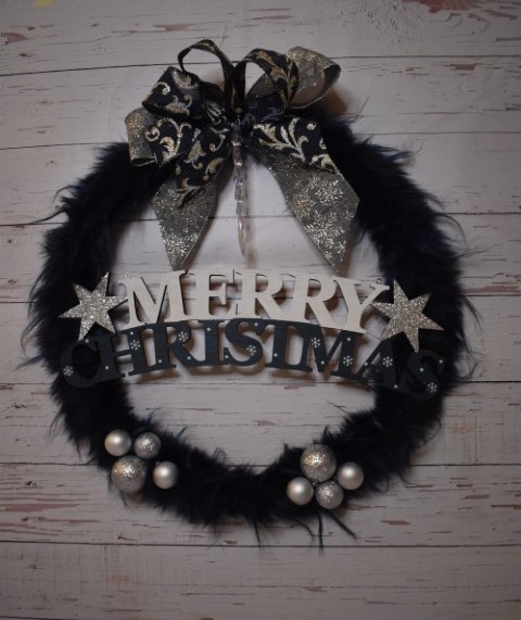 Χριστουγεννιάτικο στεφάνι με μπλε γούνα και ξύλινη επιγραφή Merry Christmas. Διάμετρος 40εκ.