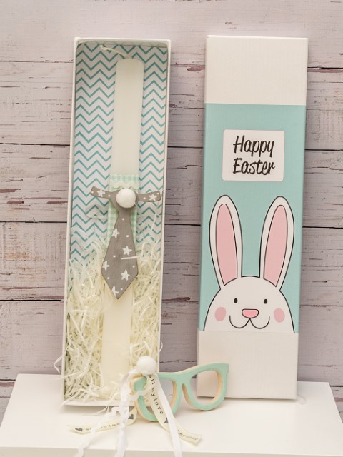Κουτί με Πασχαλινή παράσταση ( 38x10x6 ). Περιέχει λάμπάδα διακοσμημένη με ξύλινη γραβάτα και γυαλιά.