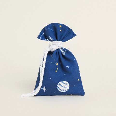 Μπομπονιέρα βάπτισης για αγόρι πουγκί με πλανήτες (διαστάσεων 22x14εκ.) δεμένη με λευκό κορδόνι και πέντε κουφέτα Χατζηγιαννάκη.