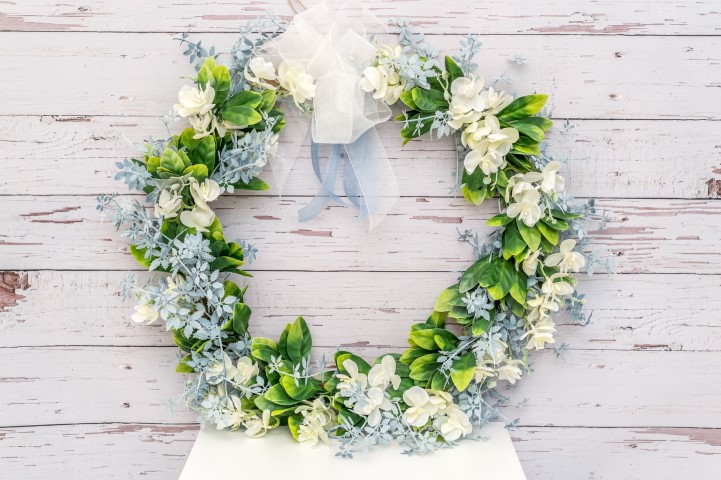 Ανοιξιάτικο πρωτομαγιάτικο στεφάνι με ορχιδέες. Δίαμετρος: 50εκ.