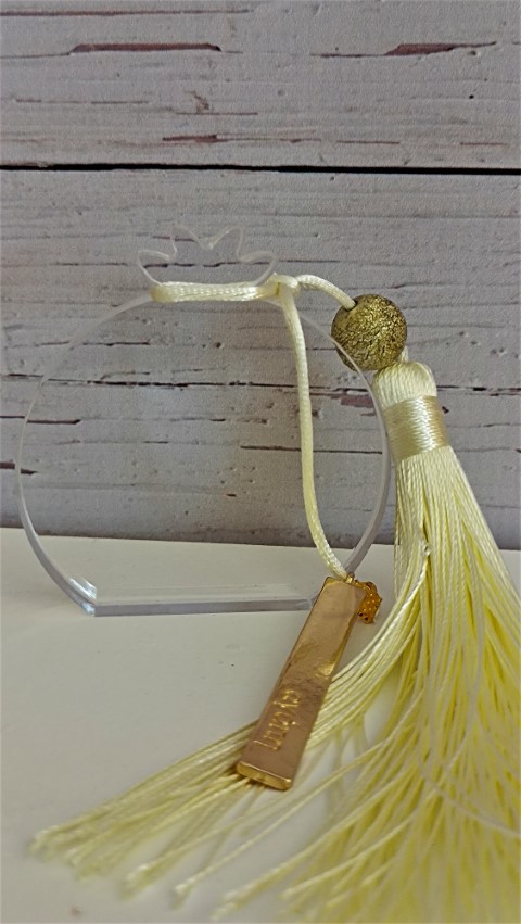 Γούρι plexiglass ρόδι με ράβδο ευχών σε χρυσό χρώμα και φούντα. Διαστασεις: 7x6.50εκ.