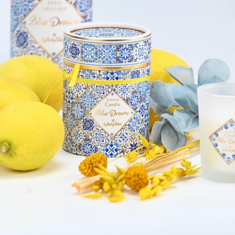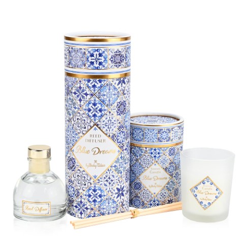 Σετ δώρου κερί και αρωματικό χώρου σε άρωμα blue dreams. Διαστάση κουτιού: αρωματικό 18,5x 7εκ.   Μπουκαλάκι 7x5,5εκ. Διάσταση κουτιού: κερί 7 x 9εκ. Κερί: 5,6 x  6,8εκ.