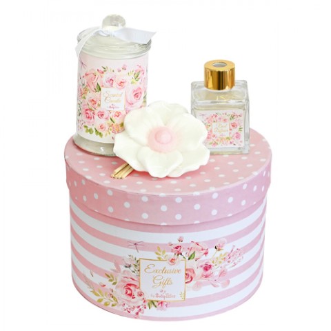 To σετ δώρου roses περιέχει: Κουτί roses 16 x 11 εκ. αρωματικό χώρου 50 ml, αρωματικό κερί σε γυάλινο βάζο και σαπουνάκι λουλούδι.