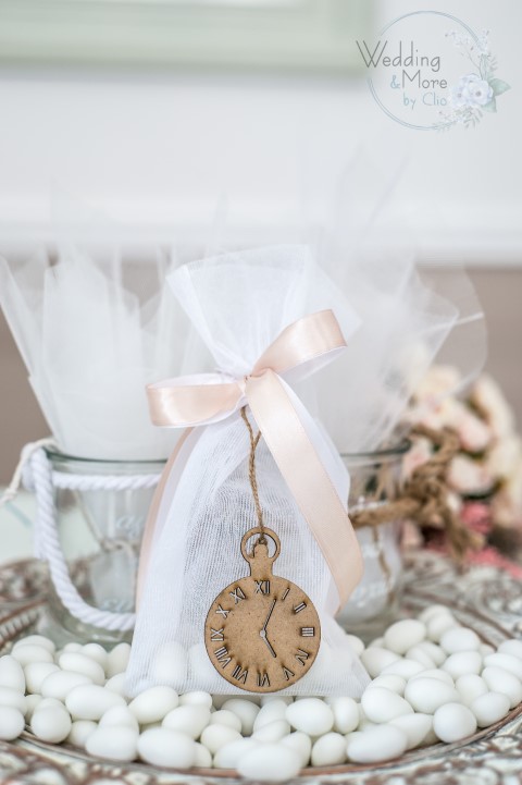 Μπομπονιέρα γάμου,τούλινο πουγκί με ξύλινο διακοσμητικό ρολόι και επτά κουφέτα Χατζηγιαννάκη. Διαστάσεις:20x11εκ.