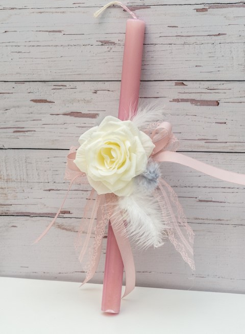 Λαμπάδα σε ροζ αντικέ χρώμα διακοσμημένη με λευκό τριαντάφυλλο φτερά και κορδέλες.